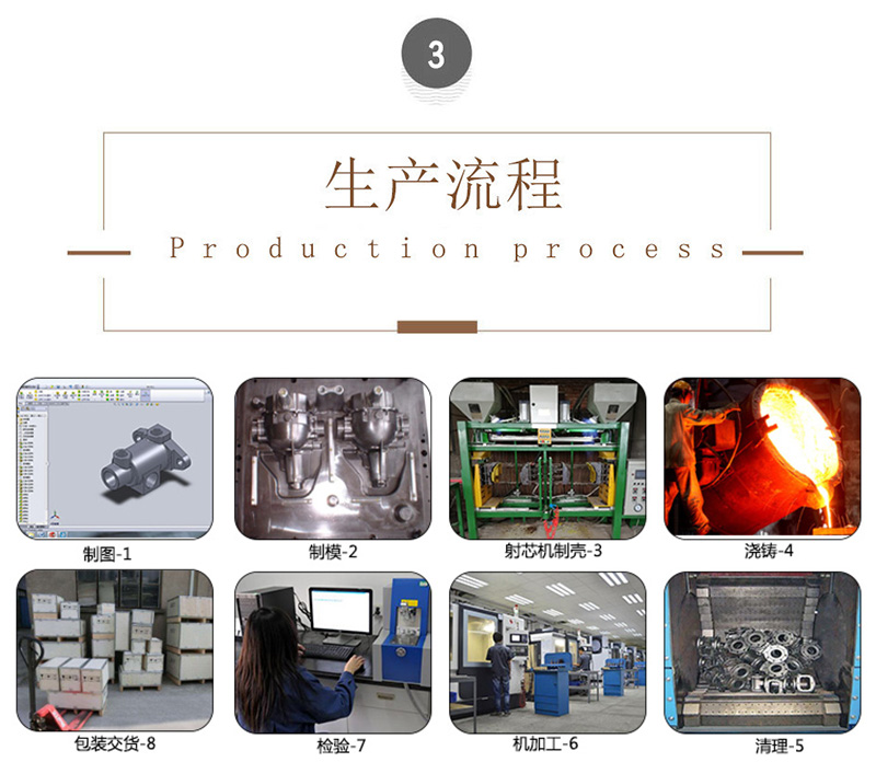 生產設備:樹脂砂鑄造、覆膜砂鑄造、失蠟鑄造、中頻電爐、爐前分析儀、退火爐等。