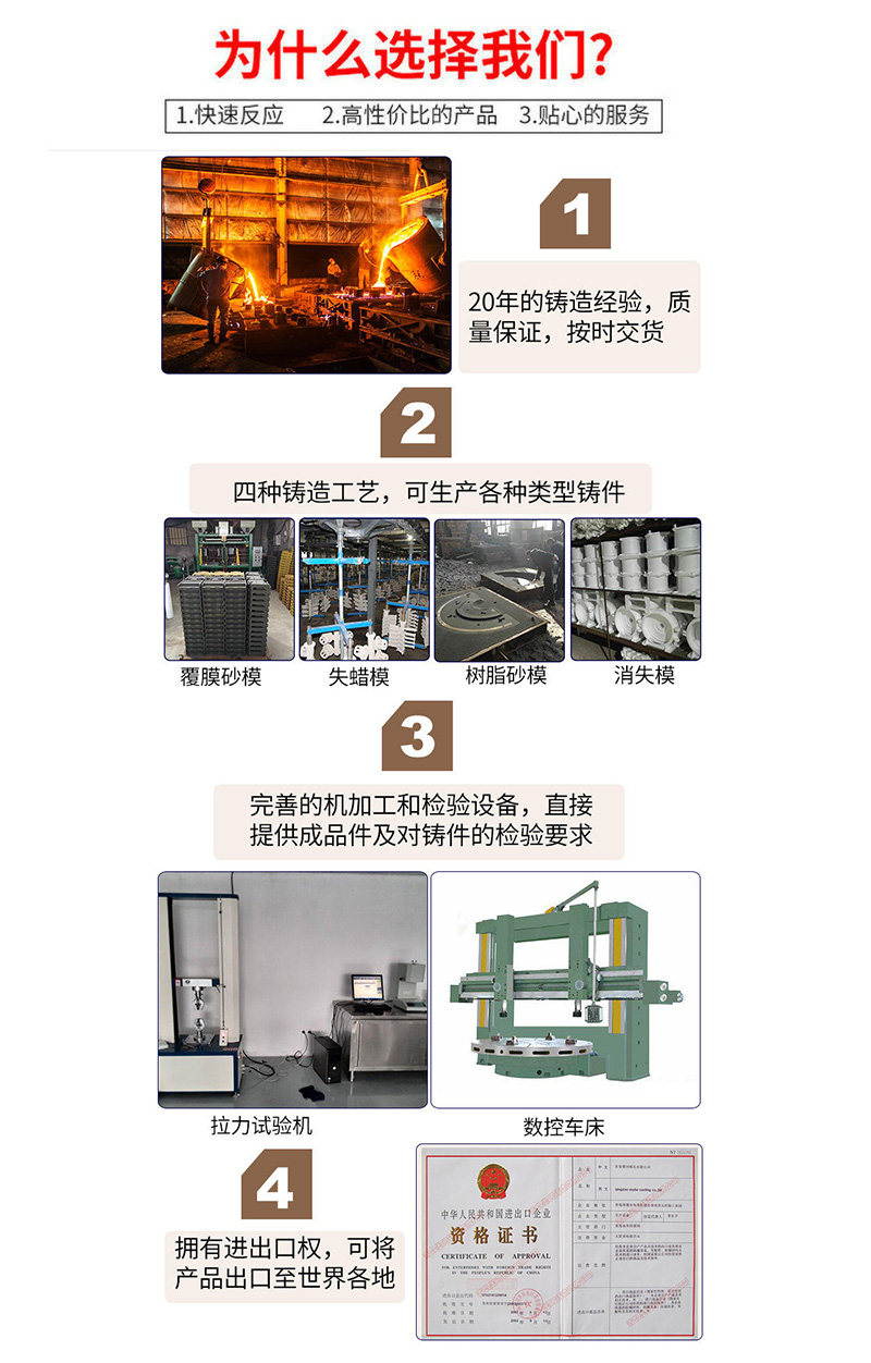 生產(chǎn)設(shè)備:樹脂砂鑄造、覆膜砂鑄造、失蠟鑄造、中頻電爐、爐前分析儀、退火爐等。